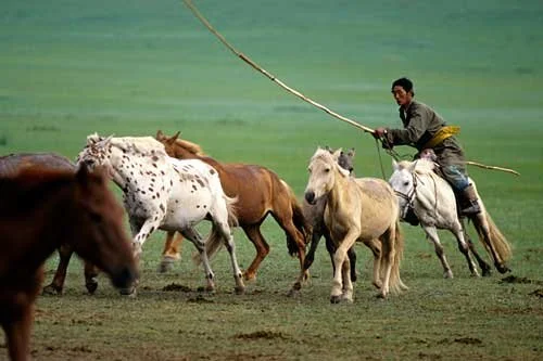 Mongolian herdsman catching horses.