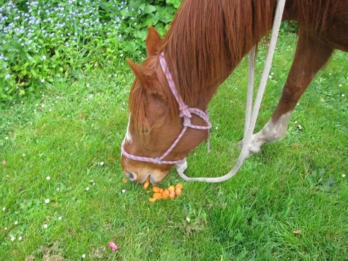 Our elderly (32yo) Arab gelding is pretty sore on his right fore. It’s from chronic arthritis in his knee and he has trouble applying weight on that leg. It’s gotten a lot worst in recent weeks. Treatment involves an anti-inflammatory each day. It’s a pill. To make it easier to medicate Guy we carve a hole in a carrot, pop the pill inside and fill the rest of the hole with apple sauce. He loves it.