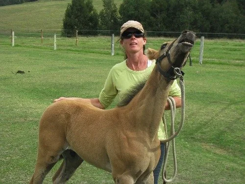 Michèle is helping a horse learn early in life that people can be the source of comfort and safety (and bum scratches).